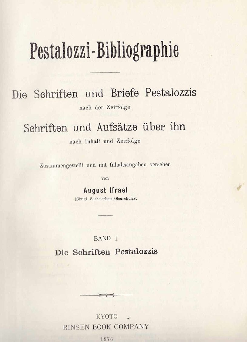 Pestalozzi-Bibliographie. Die Schriften u. Briefe Pestalozzis nach der Zeitfolge. Schriften u. Aufsätze über ihn nach Inhalt u. Zeitfolge, 3 Bde. Berlin 1903/04, Reproduktion 1976 by Rinsen book.